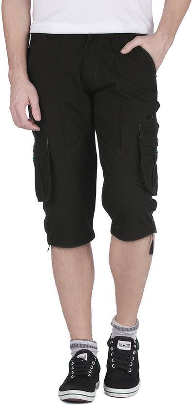 Get that carefree yet stylish look while you’re going for grocery shopping or a walk by donning these plain cargo shorts from Sports 52 Wear. Crafted entirely from 100 per cent cotton, this pair of black three fourths is perfect for a day of running errands. This casual number comes with a contrast lining and crossed loops at the back, adding to the style elements. The drawstring at the hem, stitch detail and a visible buttoned fly offer you the right blend of panache and comfort.