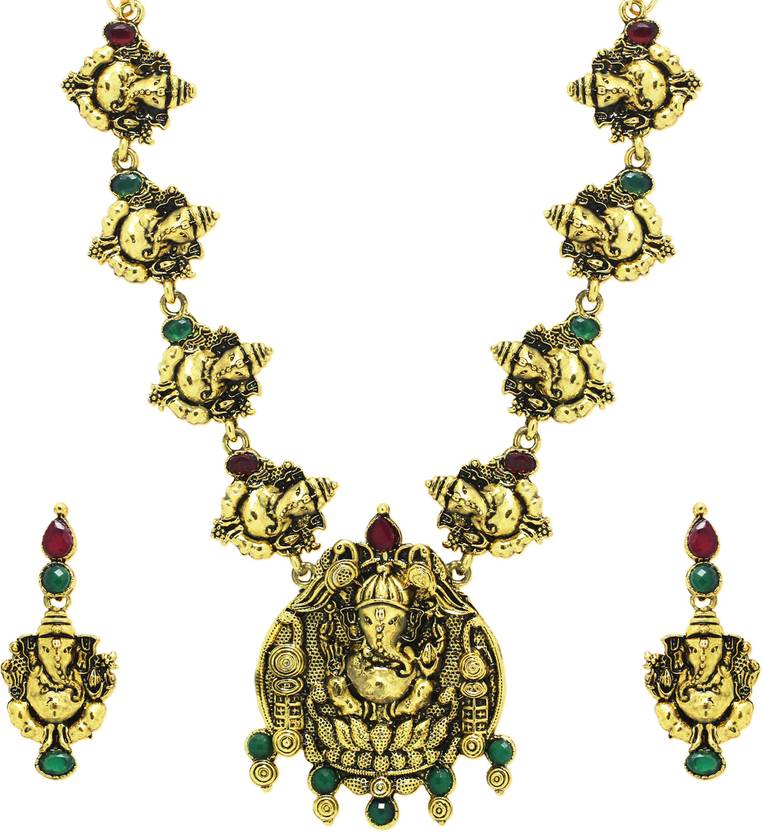 The necklace features the design of Lord Ganesha at the center and with smaller designs of Lord Ganeshas that are attached to each other with green and red beads. This jewel set consists of a necklace and a pair of earrings that feature similar Ganesha designs as the necklace.