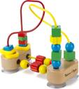 It features 4 thick, brightly colored, soft-coated wires that intertwine between the two solid wooden blocks. The 18 differently shaped wooden beads and three plastic rings spin and slide across the wires.The wooden base has suction cups on the bottom to secure this toy to any smooth surface.