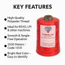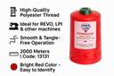• High-Quality Polyester Thread – Durable and reliable performance for heavy-duty industrial bag stitching tasks., Compatible with Revo, LPI & Other Brands – Perfectly works with all standard bag closer machines like Revo, LPI, NP-7A, and more., Tangle-Free & Smooth Operation – Designed to provide hassle-free stitching without thread breakage or jams., Bright Red Color for Easy Identification – Easily spot the thread cone in busy workspaces or factories., Bright Red Color: Vibrant color for visibility and sorting – adds a professional finish to your packaging.