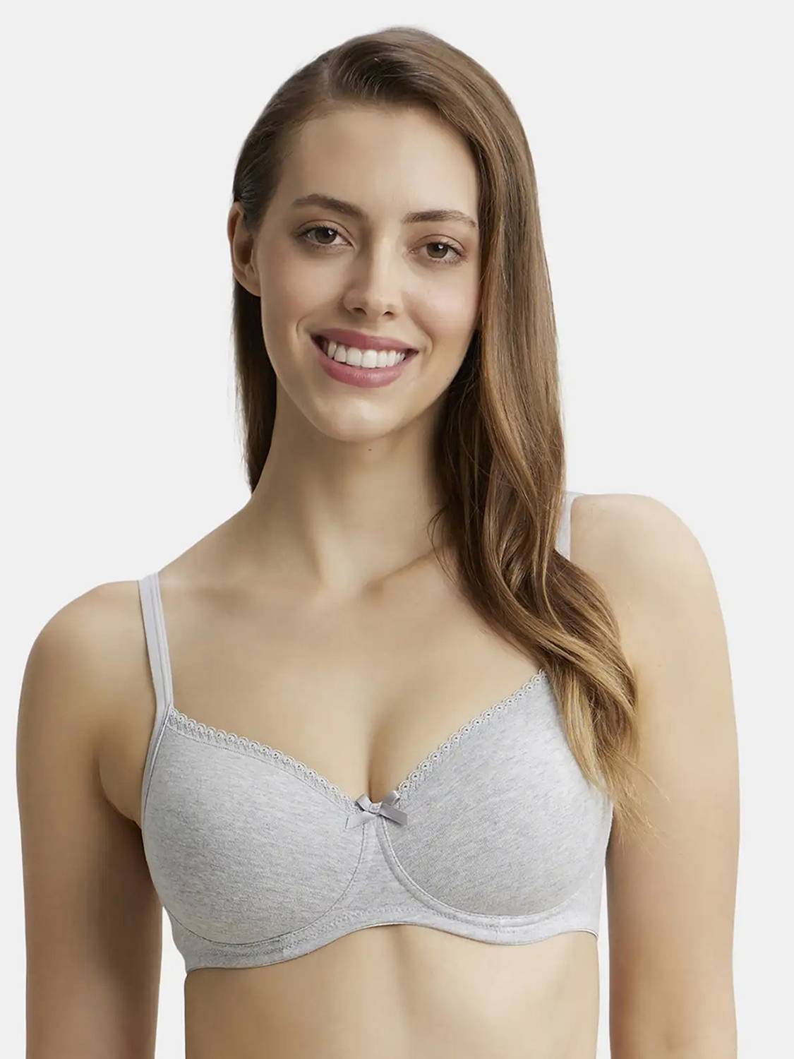 Jockey 1723 Wirefree Padded Super Combed Cotton Elastane Stretch Medium Coverage T-Shirt Bra with Lace Styling - Steel Grey Melange. Elegance and style meet comfort and quality with Jockey? Fashion Essentials Collection. This vibrant range offers multiple colors, prints, and designs and is the right fit for the woman who refuses to compromise on style. Super Combed Cotton Elastane Stretch Fabric ,Fabric Composition : Cotton and Easy Set Lycra ,Medium Coverage Bra ,Wirefree and Padded ,Lace Styling ,Soft and Smooth Adjustable Straps ,Label Free for All Day Comfort ,Based on the Size Band Of the Bra, the Number Of Hook and Eye Varies for Better Support. Hand wash, cold, Do not bleach, Do not wring, Drip dry in shade, Do not iron, Do not iron, Do not dry clean, Wash with like colours.