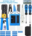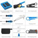 130pc Combo RJ45 Pass Through Crimping Tool Kit Cable Tester Cutter Punch Tool Cat5 Cat5e Cat6 Pass Through Connector Covers Network Wire KD1 Punch Down Pliers. RJ45 crimp tool cuts, strips and terminates extended RJ11 / 12 and RJ45 copper cables with a precision die head that provides 360 degrees of connector support during the crimping cycle. More powerful than others when the market network repair kits. NS-468 Master Cable Tester Crimper, Stripping Knife, Stripping Pliers. Impact tool awl, crosshead screwdriver, slotted screwdriver, glass head. Crimp for modular connectors RJ11 RJ12, RJ45 CAT5e, shielded CAT5e, CAT6. Designed for use with telephone lines, alarm cables, computer cables, intercom lines, speaker cables and thermostat wiring scan function - find the work cable (network cables, telephone lines, coaxial cables, buried cable and even cable behind the wall). Professional nylon zipper bag is convenient to carry and store the network repair tool and accessories.