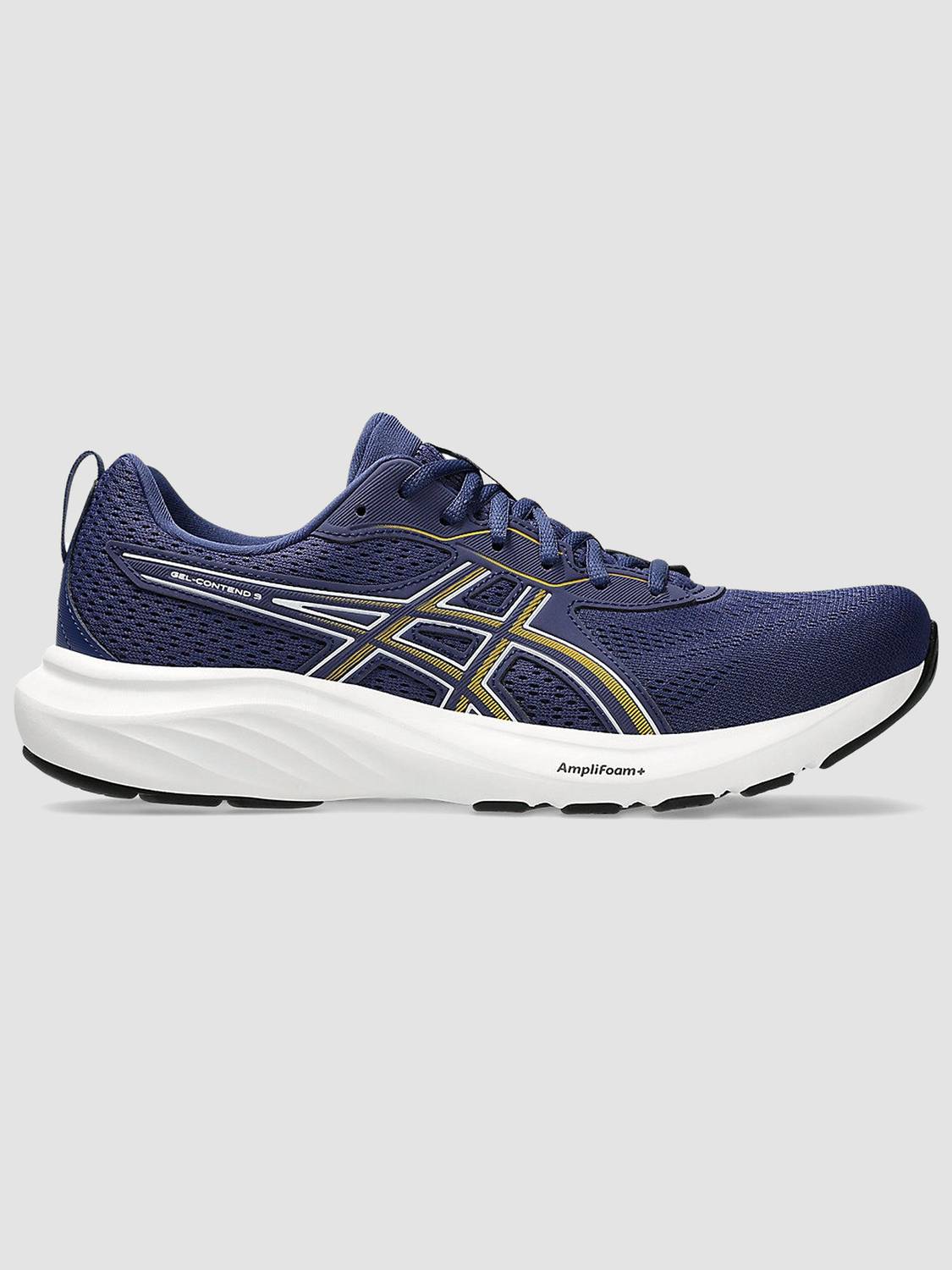 The GEL-CONTEND™ 9 running shoe provides excellent cushioning for runners seeking a combination of durability and support. Designed with an engineered mesh upper, this application stretches with the foot's natural motion and creates an excellent fit. The synthetic stitching on the overlays helps create a more supportive foothold. By following a more sustainable design approach, this shoe also uses fewer resources to color the sockliner. The reliable cushioning stems from rearfoot GEL™ technology, a durable AMPLIFOAM™ midsole, and an OrthoLite™ sockliner that are each designed to improve comfort and provide excellent shock absorption. Following the natural progression of the foot, GUIDANCE LINE™ technology helps generate a more natural and consistent stride. Additionally, the flex grooves in the outsole increase the shoe's flexibility during your step—creating a more natural feel from footstrike to toe-off.