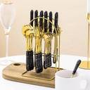tainless Steel (Spoon, Tea Spoon, Fork , Knife) with Stand - food safe, sturdy enough to meet daily use,easy clean and dishwasher safe, rust proof and durable for years., Modern and Ergonomic Design: Gold Polish makes your table settings elegant and universal, ergonomic design with balanced weight, the sleek round edge handle ensures comfortable to hold., Package Includes - 6 Spoon, 6 Tea Spoons, 6 Fork & 6 Knife