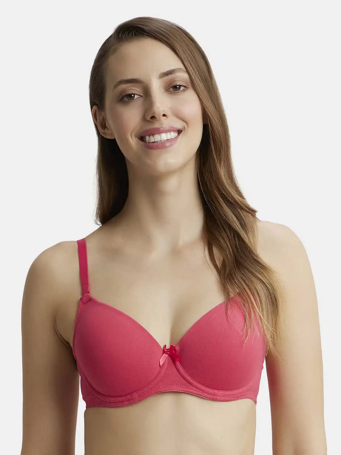 Jockey 1245 Under-Wired Padded Super Combed Cotton Elastane Stretch Medium Coverage T-Shirt Bra with Detachable Straps - Ruby. Elegance and style meet comfort and quality with Jockey? Fashion Essentials Collection. This vibrant range offers multiple colors, prints, and designs and is the right fit for the woman who refuses to compromise on style. Super Combed Cotton Elastane Stretch Fabric ,Fabric Composition : Cotton and Easy Set Lycra ,Medium Coverage ,Under-Wired, Padded ,Detachable Straps ,Multiway Styling ,All Over Print Design ,Label Free for All Day Comfort ,Based on the Size Band Of the Bra, the Number Of Hook and Eye Varies for Better Support. Hand wash, cold, Do not bleach, Do not wring, Drip dry in shade, Do not iron, Do not iron, Do not dry clean, Wash with like colours.