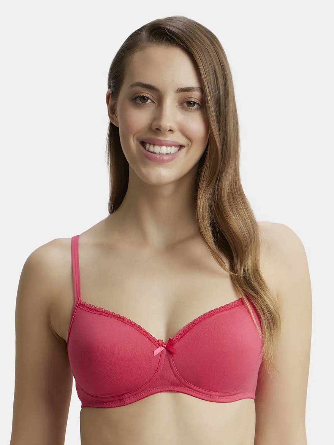 Jockey 1723 Wirefree Padded Super Combed Cotton Elastane Stretch Medium Coverage T-Shirt Bra with Lace Styling - Ruby. Elegance and style meet comfort and quality with Jockey? Fashion Essentials Collection. This vibrant range offers multiple colors, prints, and designs and is the right fit for the woman who refuses to compromise on style. Super Combed Cotton Elastane Stretch Fabric ,Fabric Composition : Cotton and Easy Set Lycra ,Medium Coverage Bra ,Wirefree and Padded ,Lace Styling ,Soft and Smooth Adjustable Straps ,Label Free for All Day Comfort ,Based on the Size Band Of the Bra, the Number Of Hook and Eye Varies for Better Support. Hand wash, cold, Do not bleach, Do not wring, Drip dry in shade, Do not iron, Do not iron, Do not dry clean, Wash with like colours.