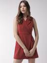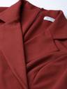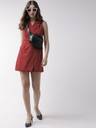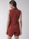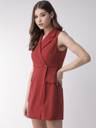Rust red polyester knit wrap style playsuit. Sleeveless with a lapel collar neckline. Blazer inspired wrap silhouette. Mock button and pockets for style. Center back zipper for fastening and ease.