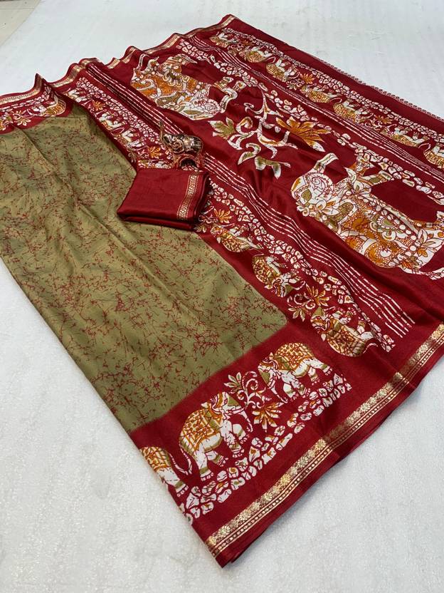 SDGRATITUDE Printed Kalamkari Cotton Linen, Cotton Silk Saree (Dark Green, Maroon)