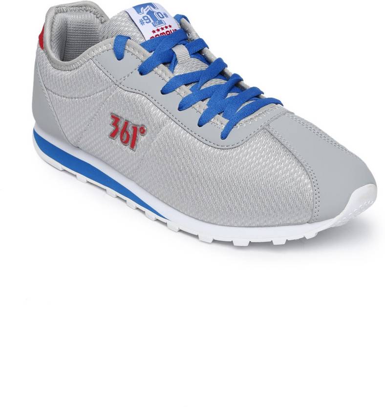A pair of grey running sports shoes, has regular styling, lace-up detailSynthetic upperCushioned footbedTextured and patterned outsoleWarranty: 3 monthsWarranty provided by brand/manufacturer. Rock that active and stylish look with these versatile athletic shoes by 361 Degree. This blue pair can be matched with comfortable shorts and an athletic top when youre going to play volleyball with your friends.