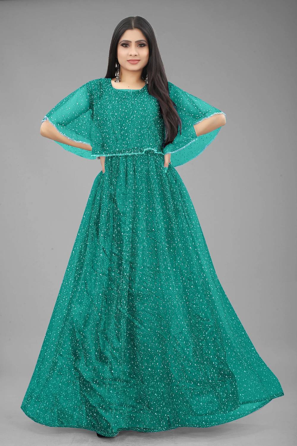 Gown Fabric : Net and Raw Silk, Gown Color : Sea Green, Gown Neck Style : Round Neck, Gown Work : Embellished, Size Guide : Free Size Fits Upto bust 44 Inch, Gown Sleeves Style : Short Sleeves, Occasion : Party Wear,Wedding Wear, Festival Wear, Stitching Type : Semi-Stitched, Season Type : Suitable For All Season