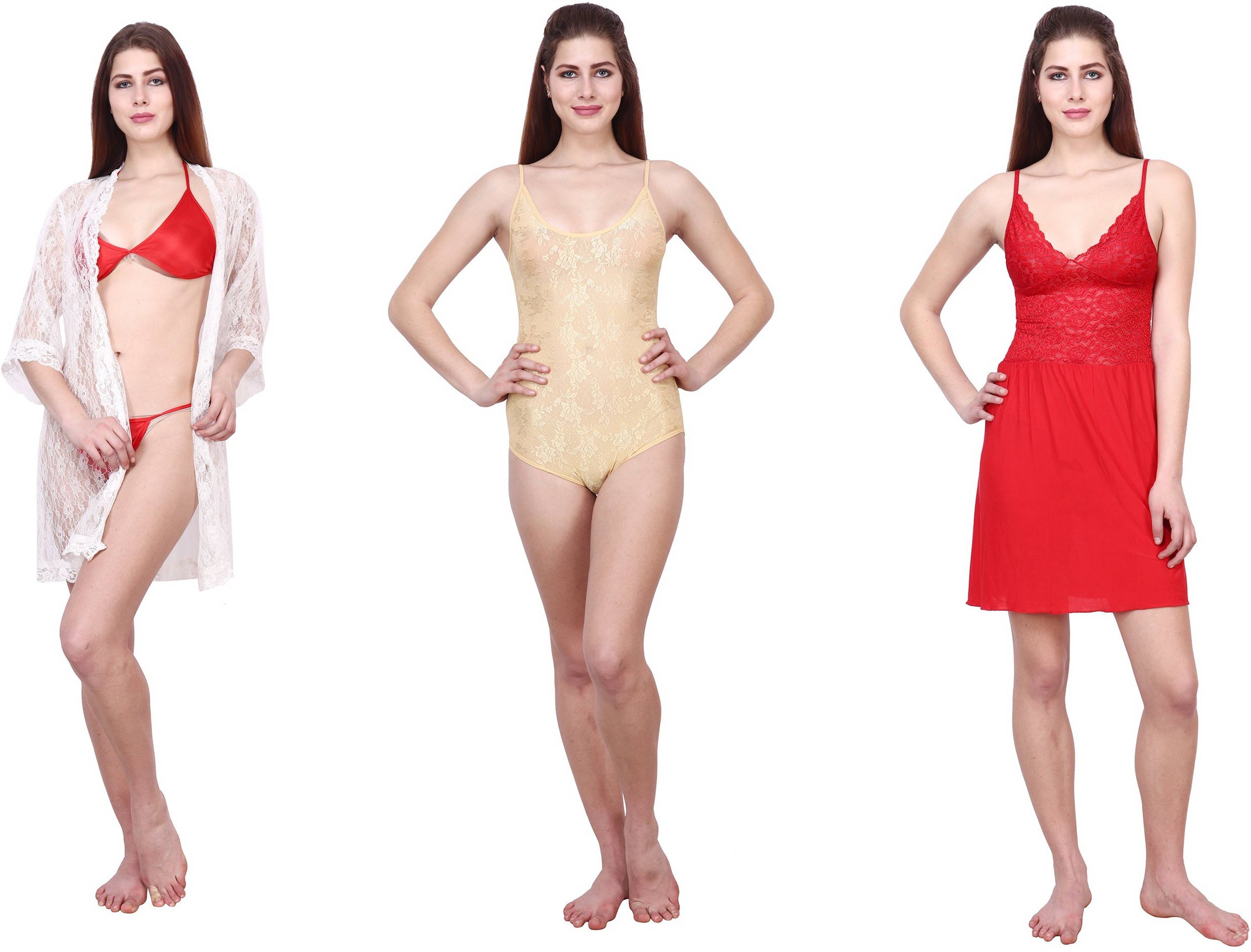 Kismat Fashion Stylish Babydoll Nighty & Satin Long Robe With Embroidered Work Experience the ultimate in romance and luxury with this delicate lace body and curve hugging baby doll