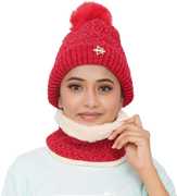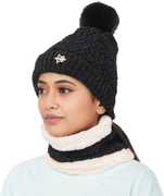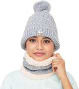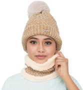 Winter Cap for Women and Girls/Winter Soft Warm 1 Set Snow Proof Knitted Ball Cap (Inside Fur) Woolen Beanie Cap with Scarf Muffler for Women Girl