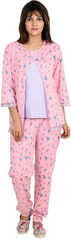 Nightsuit set comes with a double layer preppy watermelon printed top & lavender lace edging along sleeves,hem & front opening & relaxed joggers pant with broad waistband to comfort your post-maternity bump.