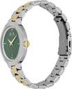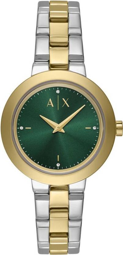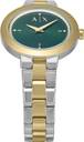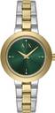 Armani Exchange's 36mm two-tone stainless steel watch features a captivating green sunray dial and elegant two-hand quartz movement. The combination of rose gold and silver tones on the bracelet adds a touch of sophistication, making this timepiece a versatile accessory for any occasion. The mineral crystal ensures durability, while the classic round case shape exudes timeless style.