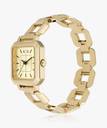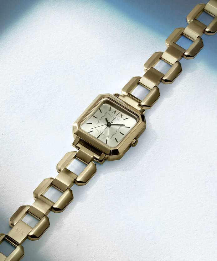 Armani Exchange's 27mm watch features a gold sunray dial, three-hand movement and gold-tone stainless steel bracelet.
