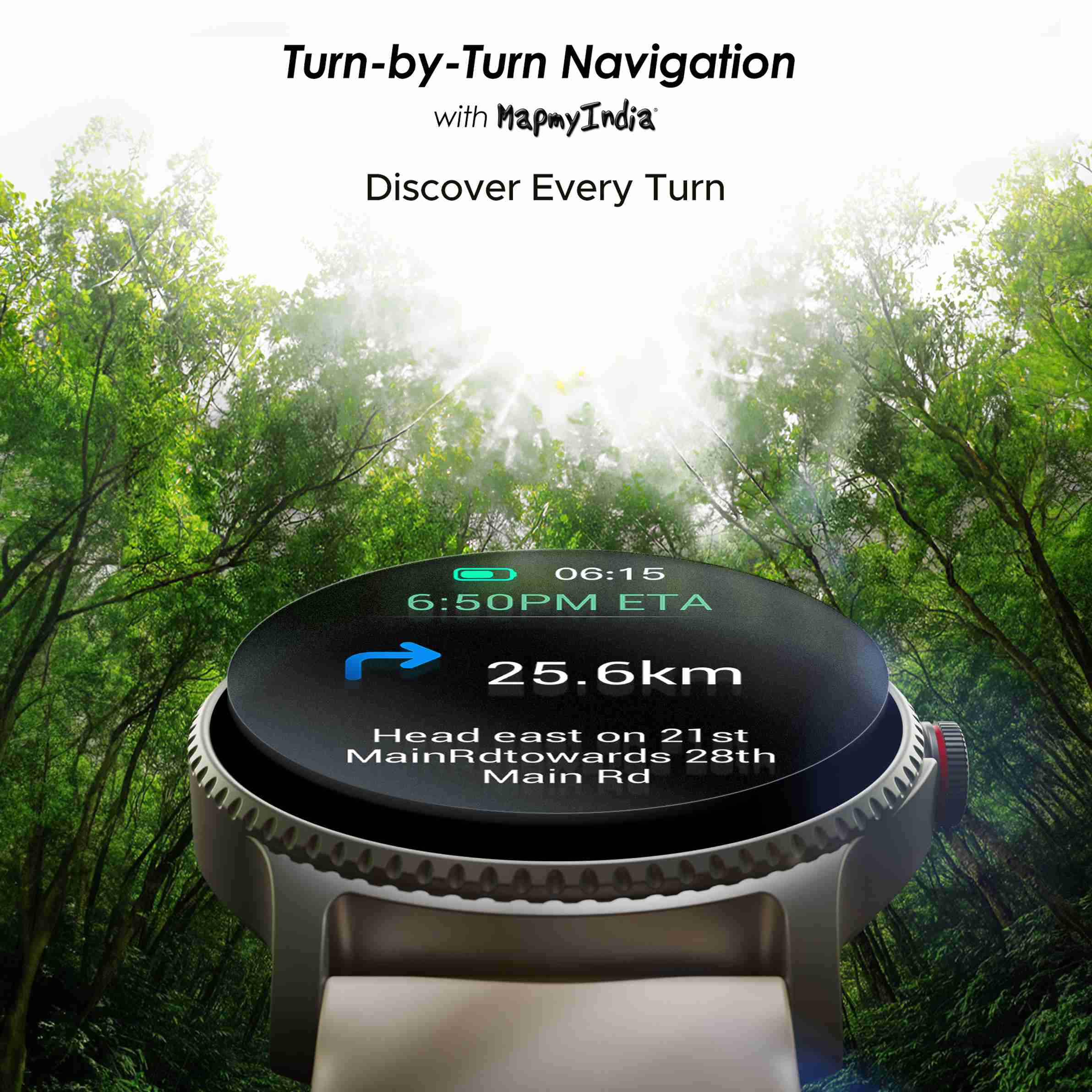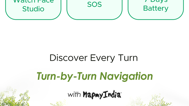 Turn-By-Turn Navigation with MapMyIndia: Whether it's a new destination or a familiar place, find your way without being lost using the boAt Lunar Discovery Smartwatch.