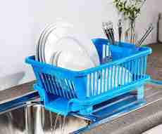 Plates are placed vertically in slots, Bowls are kept upside down for drying, Chopsticks are grouped together, Spoons are placed in the utensil holder, Utensils are separated for organization, Items appear freshly washed, Water is draining off the utensils, Plates are arranged neatly in rows, Bowls are stacked securely, Chopsticks are kept upright