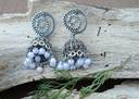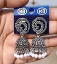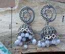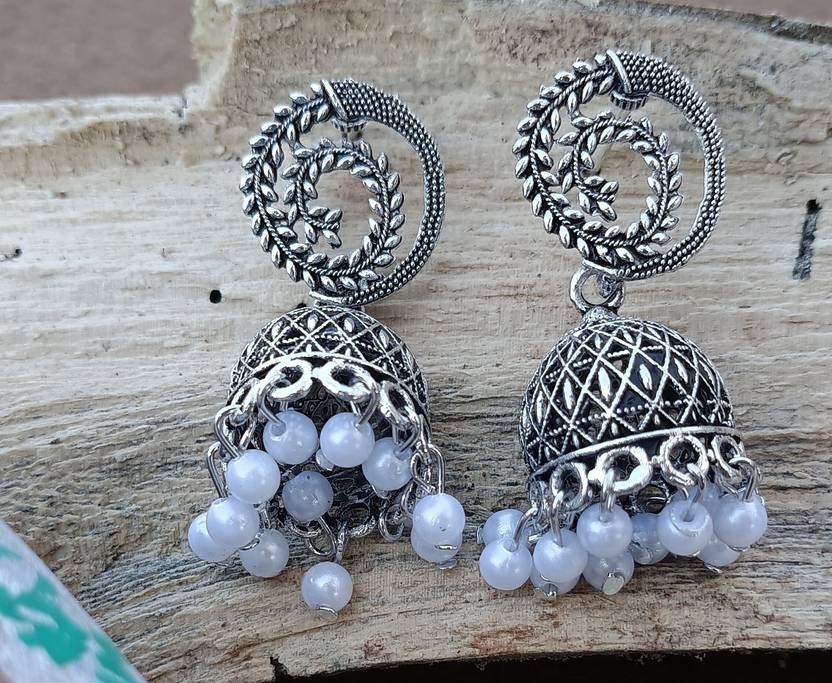 Traditional yet glamorous, oxidized silver jhumka feature intricate detailing with temple motifs. They pair well with ethnic and Indo-western outfits.