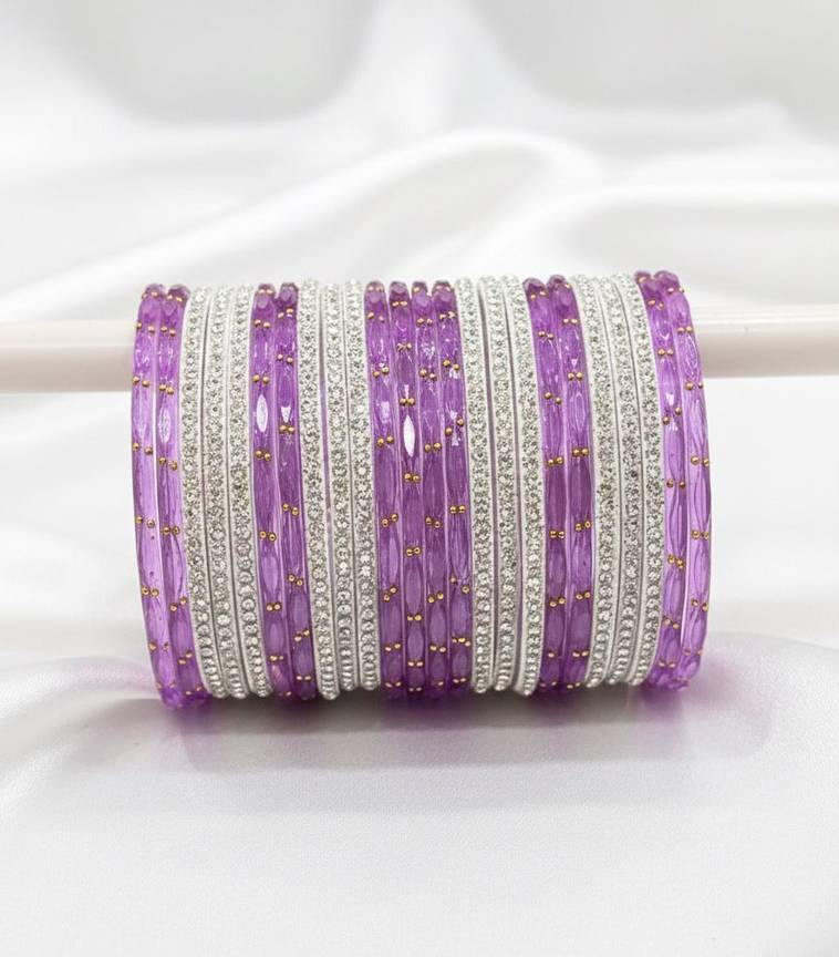 Purple and Silver Colour Bangle Set, crafted to add grace and sophistication to your look.The rich purple shade combined with shiny silver detailing creates a royal and stylish appeal, making it perfect for weddings, festivals, parties, and traditional functions.Made from high-quality material, these bangles are lightweight, skin-friendly, and comfortable for all-day wear. A perfect accessory to pair with sarees, lehengas, and salwar suits.