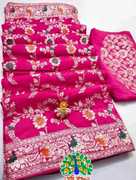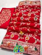 LUXURIOUS SILK: Constructed from the finest pure silk for unmatched elegance and comfort., TIMELESS ELEGANCE: Adorned with intricate embellishments for a touch of glamour and sophistication., VERSATILE WEAR: Perfect for weddings, festivals, and special occasions, adding a regal charm to your attire., INTRICATE EMBELLISHMENTS: Adorned with intricate embellishments for a touch of glamour and sophistication., COMPLETE ENSEMBLE: Easily completes your ensemble with the matching blouse included., DRAPES BEAUTIFULLY: For a feminine charm that catches everyone's attention, drape elegantly., HANDCRAFTED PERFECTION: Painstakingly made to display superb craftsmanship and meticulous attention to detail.