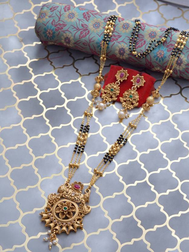 Elegant and stylish 26 inch fold over head micro gold plated daily as well as party wear mangalsutra with matching earrings for women , it will add charm to your already beautiful personality.