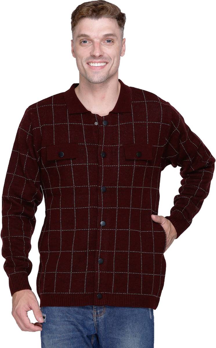 aarbee Checkered Collared Neck Casual Men Maroon Sweater