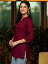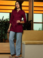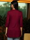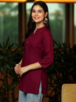 Thanks to its thoughtfully arranged features, this top presents a composed and graceful outline. In addition, its three-quarter sleeves add light coverage without restricting movement, while its Mandarin collar lends a modest, defined edge around the neckline. A button placket extends along the front, creating subtle structure through the centre. Its below-hip length ensures a balance between form and function.