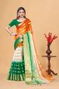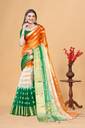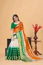 A TIRANGA organza silk saree is a type of saree that is designed to resemble the Indian national flag, commonly known as the Tiranga. The Indian national flag consists of three horizontal stripes of saffron (top), white (middle), and green (bottom) color, with a navy blue Ashoka Chakra in the center of the white stripe.