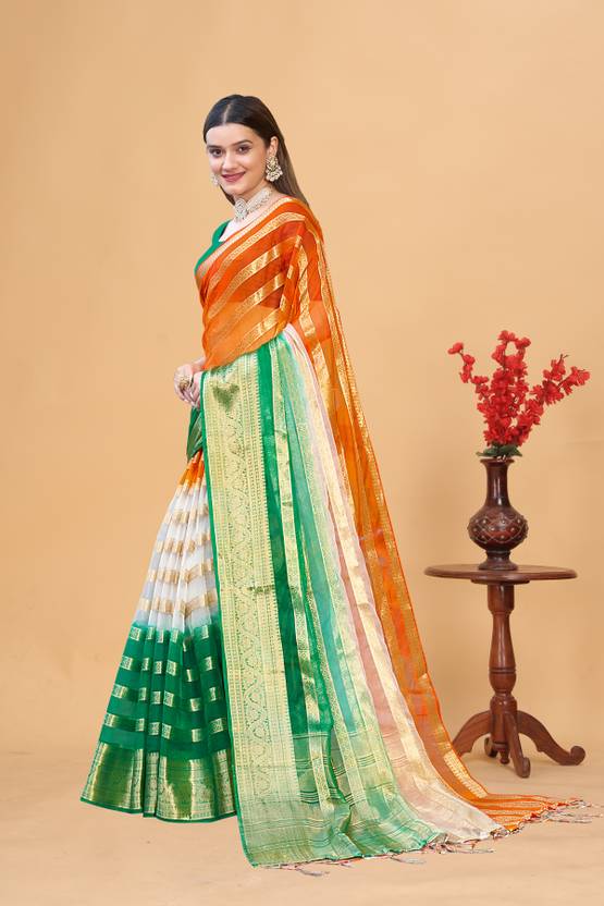 Design: The sari is specifically designed to replicate and 15th August the colors and pattern of the Indian national flag, known as the Tiranga. It features three horizontal stripes of saffron, white, and green, arranged in the correct order and width to resemble the national flag.