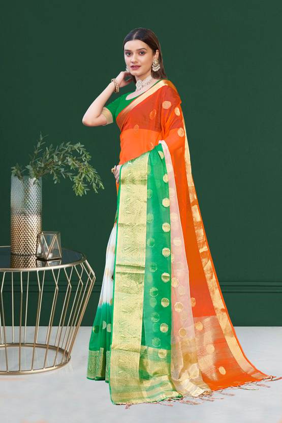 A TIRANGA organza silk saree is a type of saree that is designed to resemble the Indian national flag, commonly known as the Tiranga. The Indian national flag consists of three horizontal stripes of saffron (top), white (middle), and green (bottom) color, with a navy blue Ashoka Chakra (wheel) in the center of the white stripe.