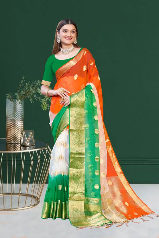 A TIRANGA organza silk saree is a type of saree that is designed to resemble the Indian national flag, commonly known as the Tiranga. The Indian national flag consists of three horizontal stripes of saffron (top), white (middle), and green (bottom) color, with a navy blue Ashoka Chakra (wheel) in the center of the white stripe.