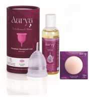 Aarya Premium Menstrual Cup for Women. Aarya menstrual cups are FDA approved and are tested, passed and certified by the SVHC REACH Test, Vaginal Membrane Irritation Test, Skin Sensitization Test and Cytotoxicity Test making it one of the first Blocomaptability Tested Made in India Brand. The raw material used for manufacturing Aarya cups is USP Class VI and made of super soft 100% medical grade Liquid Silicone Rubber. This ensures that your intimate area's safety from rashes, itching and infections is intact! Aarya Premium Menstrual cups come in 3 sizes i.e small, medium and large. It's also available in combos, The Menstrual cups are soft, sustainable, eco-friendly, hygienic and provide protection upto 12 hours. AARYA’s Menstrual Cup is used for collecting menstrual blood and is worn internally, like a tampon. It is ideal for those who care for their own health (cups don’t disrupt your natural pH) & the environment (disposal of sanitary products creates toxic waste). Cups are made of high-quality silicone that is widely applied in medical care products such as infant nipples, catheters, etc (it is toxin-free, odor-free & and hypoallergenic). With AARYA’s Menstrual Cup, you will always be prepared to take on your periods! Thanks to its design, it is an ideal menstrual aid for swimming, all other kinds of sports, traveling or common daily use! FEATURES: Flexible Rim which creates a vacuum seal helps in no leakage || RIM helps in easy removal as they release the vacuum || Curved Shape is for the perfect fit and helps for optimum comfort || Grooved stem provides anti-slip grip provides a user-friendly experience. PACKAGE INCLUDES Aarya Menstrual Cup + Cup Wash + Storing Pouch + User Manual. How to Cleanse the Cup: The cup needs to be sanitized once or twice in a month depending on the usage. After usage, boil the cup in water (5-10 minutes) to kill germs. Let it dry and store it.