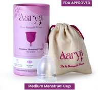 Aarya Premium Menstrual Cup for Women. Aarya menstrual cups are FDA approved and are tested, passed and certified by the SVHC REACH Test, Vaginal Membrane Irritation Test, Skin Sensitization Test and Cytotoxicity Test making it one of the first Blocomaptability Tested Made in India Brand. The raw material used for manufacturing Aarya cups is USP Class VI and made of super soft 100% medical grade Liquid Silicone Rubber. This ensures that your intimate area's safety from rashes, itching and infections is intact! Aarya Premium Menstrual cups come in 3 sizes i.e small, medium and large. It's also available in combos, The Menstrual cups are soft, sustainable, eco-friendly, hygienic and provide protection upto 12 hours. AARYA’s Menstrual Cup is used for collecting menstrual blood and is worn internally, like a tampon. It is ideal for those who care for their own health (cups don’t disrupt your natural pH) & the environment (disposal of sanitary products creates toxic waste). Cups are made of high-quality silicone that is widely applied in medical care products such as infant nipples, catheters, etc (it is toxin-free, odor-free & and hypoallergenic). With AARYA’s Menstrual Cup, you will always be prepared to take on your periods! Thanks to its design, it is an ideal menstrual aid for swimming, all other kinds of sports, traveling or common daily use! FEATURES: Flexible Rim which creates a vacuum seal helps in no leakage || RIM helps in easy removal as they release the vacuum || Curved Shape is for the perfect fit and helps for optimum comfort || Grooved stem provides anti-slip grip provides a user-friendly experience. PACKAGE INCLUDES Aarya Menstrual Cup + Cup Wash + Storing Pouch + User Manual. How to Cleanse the Cup: The cup needs to be sanitized once or twice in a month depending on the usage. After usage, boil the cup in water (5-10 minutes) to kill germs. Let it dry and store it.