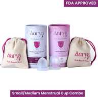 Aarya Premium Menstrual Cup for Women. Aarya menstrual cups are FDA approved and are tested, passed and certified by the SVHC REACH Test, Vaginal Membrane Irritation Test, Skin Sensitization Test and Cytotoxicity Test making it one of the first Blocomaptability Tested Made in India Brand. The raw material used for manufacturing Aarya cups is USP Class VI and made of super soft 100% medical grade Liquid Silicone Rubber. This ensures that your intimate area's safety from rashes, itching and infections is intact! Aarya Premium Menstrual cups come in 3 sizes i.e small, medium and large. It's also available in combos, The Menstrual cups are soft, sustainable, eco-friendly, hygienic and provide protection upto 12 hours. AARYA’s Menstrual Cup is used for collecting menstrual blood and is worn internally, like a tampon. It is ideal for those who care for their own health (cups don’t disrupt your natural pH) & the environment (disposal of sanitary products creates toxic waste). Cups are made of high-quality silicone that is widely applied in medical care products such as infant nipples, catheters, etc (it is toxin-free, odor-free & and hypoallergenic). With AARYA’s Menstrual Cup, you will always be prepared to take on your periods! Thanks to its design, it is an ideal menstrual aid for swimming, all other kinds of sports, traveling or common daily use! FEATURES: Flexible Rim which creates a vacuum seal helps in no leakage || RIM helps in easy removal as they release the vacuum || Curved Shape is for the perfect fit and helps for optimum comfort || Grooved stem provides anti-slip grip provides a user-friendly experience. PACKAGE INCLUDES Aarya Menstrual Cup + Cup Wash + Storing Pouch + User Manual. How to Cleanse the Cup: The cup needs to be sanitized once or twice in a month depending on the usage. After usage, boil the cup in water (5-10 minutes) to kill germs. Let it dry and store it.