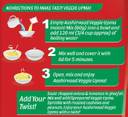 Ingredients | - Semolina, Refined Palmolein, Dehydrated Carrot (3.9%), lodized Salt, Groundnut (2.7%), Ghee, Chana Dal, Urd Dal, Cashewnuts (1.5%), Dehydrated Onion (1.3%), Anticaking agent (INS 551), Dehydrated Green Chilli, Sugar, Mustard (0.7%), White Sesame Seeds, Dehydrated Garlic, Cumin, Curry Leaves (0.1%) and Acidity Regulator (INS 330)