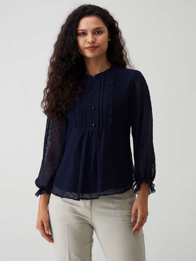 AASK Polyester Solid Plain Navy Blue Color Regular Top