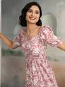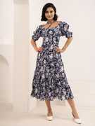 Elevate your style with Aask Women's Peach Floral Dress, featuring botanical prints, puff sleeves, and a chic halter neck. Crafted from polyester, this calf-length, tiered design offers a flattering fit, perfect for any occasion.
