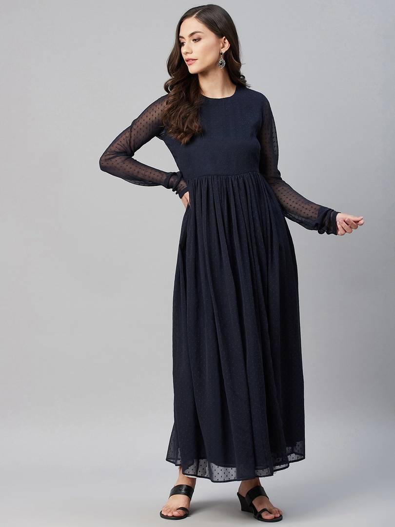 Aayu women fit & flare Georgette fabric, round neck, solid print, maxi length, full regular sleeves & closer zip casual and party wear dresses.
