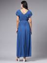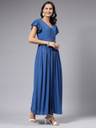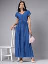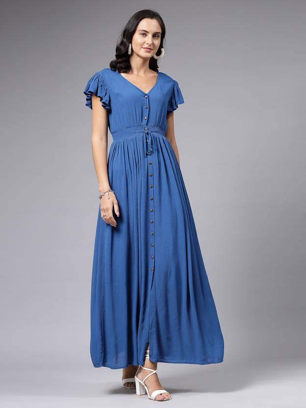 Aayu women V neck line button attached front slit cut Maxi Dress with ruffle sleeve in rayon fabric, elastic attached in waist line .