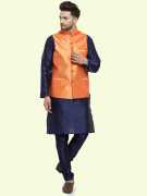 Blue and grey self design kurta with pyjamas and nehru jacket Blue straight knee length kurta, has a mandarin collar, long sleeves, straight hem, side slits Blue self design pyjamas, drawstring closure Grey self-design Nehru jacket, has a mandarin collar, full button placket, sleeveless, three welt pockets.