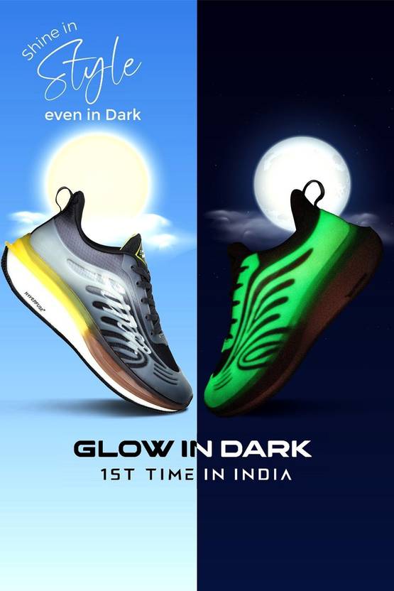 Introducing our cutting-edge men's sports shoe, a fusion of innovation and style. Crafted with a unique radium upper that glows in the dark. The breather upper ensures optimal ventilation, keeping your feet cool and dry. Beneath, the Hyperfuse EVA sole delivers exceptional durability and responsive support, while the memory insole molds to your foot's contours for supreme comfort.