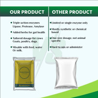 Featuring a combination of triple-action enzymes such as lipase, protease, and amylase, this cow food is developed to support smooth digestion in a variety of livestock. Courtesy of its added live yeast culture, it encourages the maintenance of gut flora, which in turn supports consistent feed usage. Dicalcium phosphate brings added nutritional support, contributing to the overall well-being of animals. Moreover, herbs included in the blend assist with digestive comfort and offer relief during minor digestive imbalances. The measured dosage has been planned for cows, goats, poultry, and dogs. In addition, this blend can be mixed with water or milk, making it convenient to include in everyday feeding.