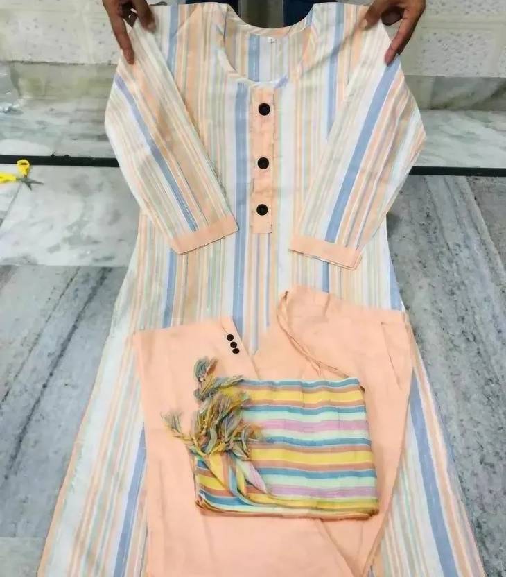 Orange Multi Color Cotton Kurti Pant With Dupatta Set (40)