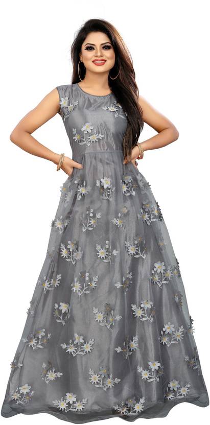This Gown is Crafted with Flower over Net Fabric Having Embroidery Work on it. Gown is Comes With Inner Attached. Gown Color Grey, Gown Length is 56 Inch. It has Sleeveless Gown. Gown is Semi-Stitched which can be fitted up to 42 inch Bust Size. Gown is Emblished with Fancy Flower. Dry Clean Or Normal Hand Wash. Product Color May Slightly Variation Due To Photographic Lighting Or Your Screen Settings And Other Accessories Are Only Modelling Purpose.
