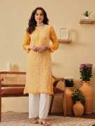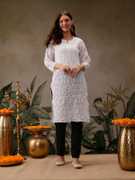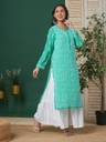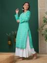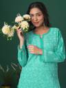 SKU: A95546 Fabric: Faux Georgette Length: 43inches Neck: Round Neck Sleeves: Quarter Sleeves Slit Detail: Side slit Color: Sea Green Embroidery: Bakhiya, Keel Kangan and Phanda Thread: Cotton Thread Color : White Touch and Feel: Soft and Comfortable Silhouette: Sea Green Faux Georgette chikan kurti has a straight long finish along with straight hems. This is readymade prewashed kurti. The back and sleeves of the kurti are decorated with loosely scattered motifs. While the front of the chikankari kurti is enhanced with dense embroidered neck and motifs are placed on the rest of the part. Disclaimer: This product is hand embroidered and may have slight dissimilarities that are a natural outcome of the human involvement in the process. These minor variations of Stitches/Motifs add to its charm and ensure you have a unique product.
