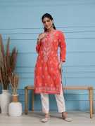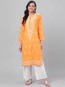 Length: 43 inches Touch and Feel: Smooth and soft Being the most sought-after art form in India, Lucknow Chikankari has carved a niche for itself. The Green Hand Embroidered Chikan Kurti is an example of true craftsmanship. Needlework with the white cotton thread is finely curated on this kurti. These threads create signature chikan embroidery stitches-”Bakhiya“, ”Phanda“ & "Keel Kangan." on rich cotton base. This kurti offers it, wearers, an extremely comfortable and relaxed silhouette.At Ada we are dealing with needle craft which is GI mapped and recognized by Trips internationally which ismultiple washed leaving the product free of colour bleeding and shrinkage. Since products are pre washed they cannot match the artificial quote / finish of a factory finish.