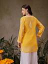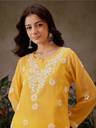 This ensemble is a very chiq and bohemian outfit, Faux georgette Short Top With Slip. It has embroidered notch neckline, graced with ghaas patti embroidery. Floral motifs with ‘phool kadhai’ are delicately placed on this Chikan Topic and a border at the bottom completes the look of the kurti. The fabric is very soft.