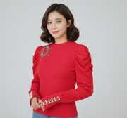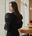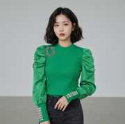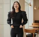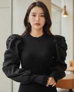 This elegant black top features a comfortable ribbed knit body complemented by voluminous puffed sleeves, adding a touch of sophisticated drama. The contrasting textures create a modern and versatile piece. Perfect for pairing with tailored trousers for a formal look, a sleek skirt for an evening out, or high-waisted jeans for a chic casual ensemble.