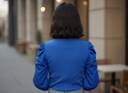 This elegant blue top features a sophisticated mock neck and stylish puffed sleeves, adding a touch of volume and flair. The cuffs are adorned with delicate pearl embellishments, mirroring a similar decorative detail on the chest, which enhances its refined appeal. Crafted from a comfortable, ribbed fabric, this top offers a flattering, fitted silhouette. It can be effortlessly styled with high-waisted jeans for a casual yet chic ensemble, or paired with a sleek skirt or tailored trousers for a more polished, semi-formal look. Complement it with delicate jewelry and heels to complete your outfit.