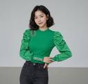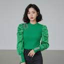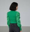 This stylish green top features a ribbed knit body for a comfortable fit and voluminous satin puff sleeves that add a touch of elegance. A sparkling embellished detail adorns the chest/shoulder area, while the cuffs are beautifully decorated with pearl accents. This versatile top can be effortlessly paired with black jeans for a casual yet chic ensemble, or dressed up with a skirt or tailored trousers for a more sophisticated occasion.